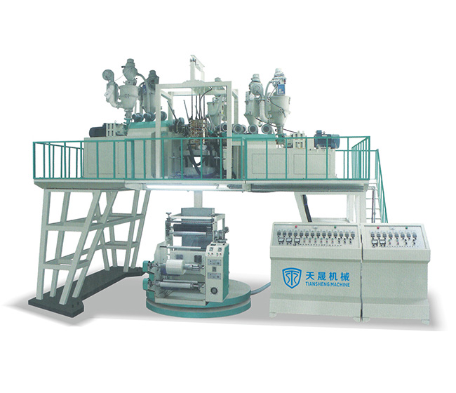该机是自行研制的下吹水冷带旋转牵引的高性能、全自动薄膜吹塑机组。该机采用下吹及自溢水冷法生产制品。其制品具有透明度和良好的性能,并且有纠编装置、电晕处理、静电消除及自动精密温度控制等装置供客户选配。其中多层共挤机适合加工PP、PE、PA、LLDPE、MLLDPE、HV等原料,所生产的制品还具有良好的阻隔性、热封性、耐低温性和力学性能,为高档商品包装材料。
